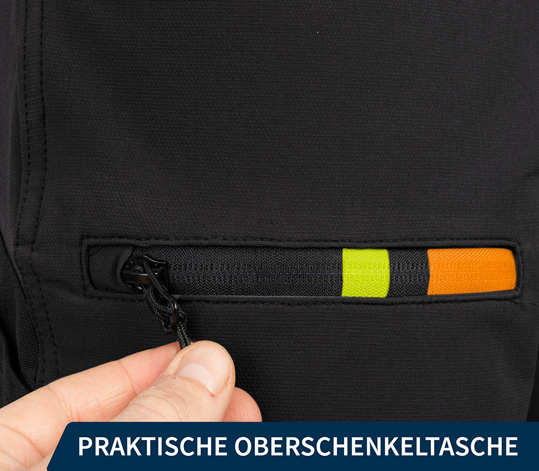 • vorne: Reißverschlusstasche auf dem rechten Bein
